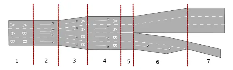 lanes=3 turn:lanes=slight_left|slight_left;slight_right|slight_right * destination:lanes=A|A;B|B *