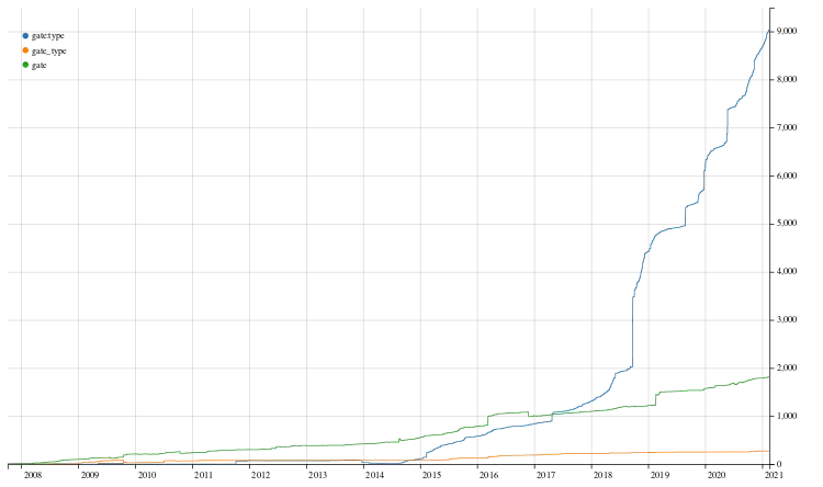 gate:type=* stale zyskują zastosowanie następujące https://wiki.openstreetmap.org/w/index.php?title=Tag:barrier=gate&type=revision&diff=1221062&oldid=1184990 dodatkowo w 2015 roku. Niestety z perspektywy czasu nie trafił gate=*. Jak widać z https://taghistory.raifer.tech/#***/gate:type/&***/gate_type/&***/gate/, gate=* miał znacznie więcej zastosowań (~450 > ~25) wcześniej, dopóki nie został przekroczony w 2017 roku o gate:type=* o ~1k instancji. Co więcej, jest większy wzrost w gate:type=* od 2018 niż gate=*Inne wartości dla barrier=*_gate: