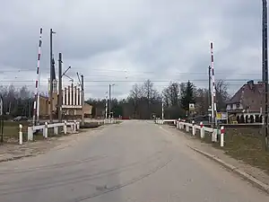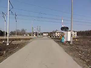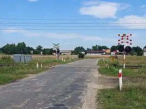Przejazd kolejowy (gdzie droga przekracza linię kolejową na tym samym poziomie - tzn. bez mostu). Niektóre mają barierki lub bramki, które są obsługiwane automatycznie lub ręcznie.