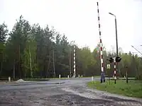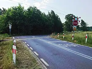 | Miejsce przecięcia linii toru kolejowego oraz drogi samochodowej/pieszej chronione szlabanem. |