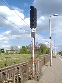Level crossing signal | A signal that indicates that the technical equipment (lights, barriers, bells) of a level crossing is active to warn automobile drivers about an approaching train. |