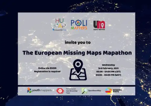 The European Missing Maps Mapathon was the first mapping event jointly organised by 3 university groups from different European countries: HuMap from UniTrier (Germany), PoliMappers from Politecnico di Milano (Italy) and UNIPO Mappers from University of Prešov (Slovakia). The event was virtually held February 3rd, 2021 - 17:00 CET.
