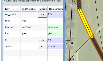 However, by contrast the process of getting to the merging UI is not fully intuitive. Although the user might see the small text “You have selected a Background Feature.” which hints about some special status, there is no visual indication that Control-click is the special shortcut to be used, and it has to be selected very carefully because there are two lines in the region (the thick, now yellow, one, and the OSM one, requiring considerable manual dexterity.