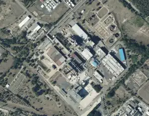 - A cluster of large industrial buildings (that are housing boilers and turbine halls) ;
