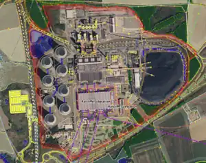 Covered elements include the main plant site, turbines, chimneys, cooling towers, storage areas, water intake and treatment structures, and generation substations.