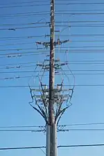 | 26.4 kV, 27.6 kV | Distribution | Common distribution voltage in Ontario, mostly fed by the 115 kV network. | Ordinary sized poles in suburban or rural areas and back alleys, or underground cables. Lines carrying multiple circuits may not be obvious from aerial imagery. In most of southern Ontario, poles often have insulators directly mounted onto them. 26.4/27.6 and 13.8 kV systems are generally looped, with many single-phase or three-phase branches and backup connections from other substations provided by open disconnector switches at the end of feeders. |