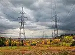 | 25 kV | Distribution | Utilisée dans la majorité du système de distribution. 3 phases | Poteaux de taille ordinaires, ou des câbles souterrains. La présence de plusieurs circuits peut ne pas être évidente sur la photographie aérienne. Les systèmes 25 et 14.4 kV sont généralement bouclés, avec de nombreuses branches monophasées ou triphasées et des connexions de secours à partir d'autres postes fournies par des sectionneurs ouverts à l'extrémité des départs. |