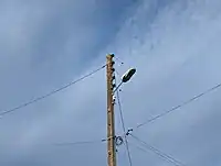 Ligne BT, câble nu Le câble nu est constitué de 4, 5 voire 6 fils nus : 3 conducteurs, un neutre et éventuellement l'éclairage public. On le reconnaît facilement avec les isolateurs présents sur le support et il n'est pas possible de discerner la section depuis le sol. |