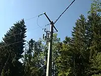 Ligne HTA, câble torsadé Ces câbles aériens torsadés sont constitués de 3 conducteurs isolés, semblables aux câbles souterrains. Ces torsades ressemblent aussi aux câbles basse-tension mais sont sensiblement plus lourds et gros, de sorte à ce qu'on puisse facilement faire la différence entre les deux sur le terrain. Sans parler du fait qu'ils se connectent aux lignes à trois fils alors que la basse tension a au moins 4 conducteurs. Ils sont utilisés ponctuellement pour éviter les amorçages avec la végétation. |
