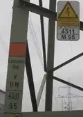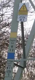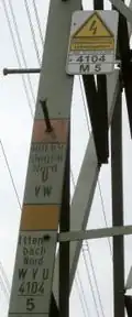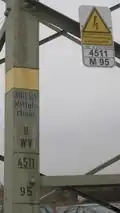 - Ein großes M. Dieses scheint erst mit den reflektierenden Schildern eingeführt worden zu sein (zumindest was die Sichtbarkeit am Mast selber betrifft). Im VEW-Altnetz kan auch der erste Buchstabe der Ziel-Umspannanlage hier stehen (z.B. H für Herne).