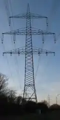 - Der Name des Stromkreises. Jeder Stromkreis trägt einen im RWE-Netz eindeutigen Namen. Die Namen lehnen sich an die Namen von Unterwerken (z. B. Sechtem, Siegburg, Gremberghoven), Kraftwerken (z. B. Biblis), Städten, Orten und Stadtteilen (z. B. Troisdorf, Bonn, Limperich), Firmem (z. B. Lemmerz, Mannstaedt, Bandstahl, Anilin (das A in BASF)), Landschaften (z. B. Nette, Siegtal, Mittelrhein) oder Bergbaugebieten (z. B. Knapsack, Berggeist) an. Die meisten dieser Namen treten paarweise auf und werden dann durch die Himmelsrichtungen Nord und Süd bzw. Ost und West oder durch eine Nummerierung 1a, 2b, 3c oder 4d unterschieden. Dieser Zusatz gehört immer zum Stromkreisnamen - manchmal fehlt er aber auch. Die Stromkreise von den Bildern heißen also 'Liessem Ost' und 'Mittelrhein'. Es ist auch nicht notwendig, dass es neben 'Liessem Ost' zwingend einen Stromkreis 'Liessem West' geben muss (in diesem Fall weiß ich es noch nicht mal). Ebenfalls ist es nicht notwendig, dass Stromkreise mit einem paarigem Namen immer am gleichen Mast verlaufen müssen. So verlaufen z. B. die Stromkreise 'Siegburg Nord' und 'Siegburg Süd' zum Teil auf den gleichen Masten. Dann trennen sie sich aber 245064868