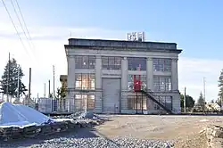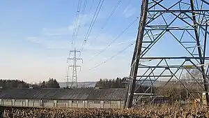 | Note | The shadow of the power line's conductors are clearly visible in this satellite image. | Two different types of power towers one next to another, supporting different voltage lines. | Insulators on power towers are not drawn or tagged in OSM. | Insulators on power portals are drawn and tagged when the portal is being used by a line. | A power line ending on a power terminal on a building. |