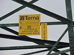 Sulla mascherina di ogni pilone c'è la sigla FS che indica la proprietà dell'elettrodotto, il codice, il compartimento di appartenenza e la tensione di esercizio in kV.