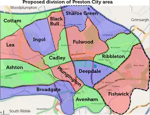The various wards [1] of Preston are perhaps not very convenient for mapping purposes. This table therefore uses arbitrary divisions as shown in the image above:
