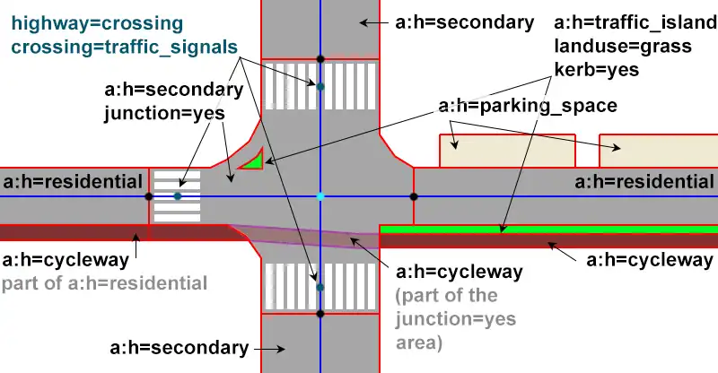 This page shows how to divide streets and their junctions in separate area:highway elements.