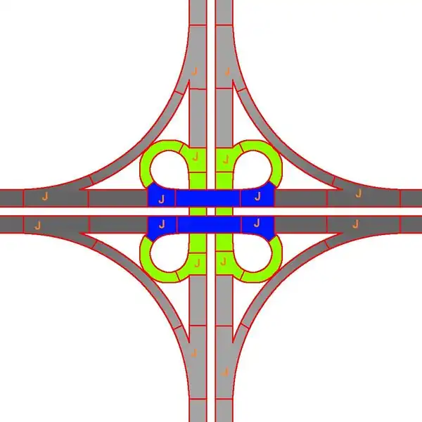 Note: In this case: all polygons have area:highway=* (probably motorway, motorway_link or trunk), this one with orange J's have additionally junction=* tag, blue colored polygons gets additionally tag: layer=1.