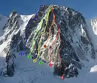 The way number 4 and 7 pass by mostly visible gullies in the cliff and on the rightmost side of the image there is a couloir