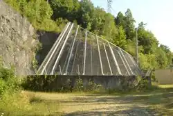 A big siphon allowing water to cross a valley. Only half side is visible on the picture, tunnels or pipelines are connecting each side at equivalent altitudes. The siphon is a pipe flow waterway. |