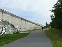 | The path runs parallel to a motorway, which is elevated at some distance and behind a noise barrier. Further along the path, there is a dense row of trees in between, with an access road to the path on the ramp visible. The road traffic is hardly perceptible on the path; instead, the path is characterized by the adjacent vegetation in the further course. Navigation instructions such as "follow the path along the motorway" might lead to misunderstandings.