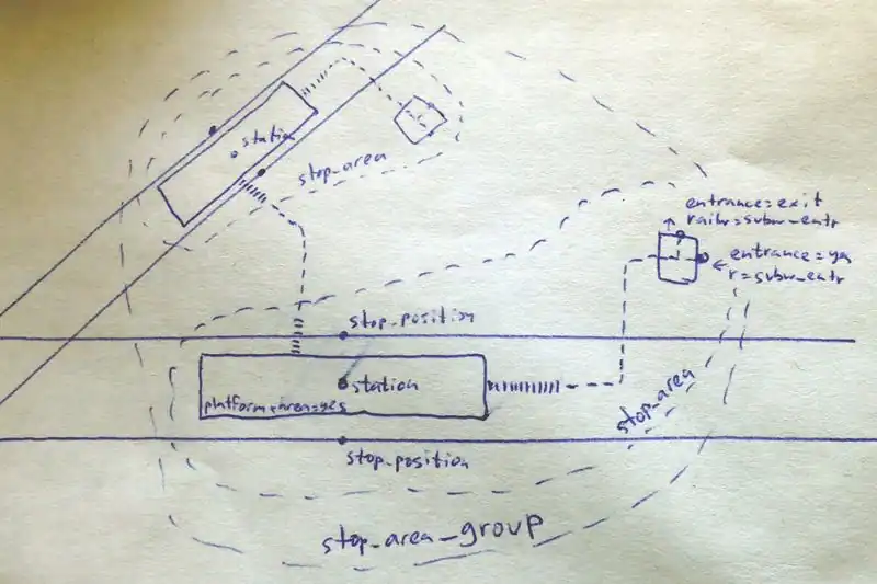 Of these objects, only the station node is mandatory for each station. Also, if possible, mark the subway entrance points, so routers won't bring people to an overground location of an underground station.