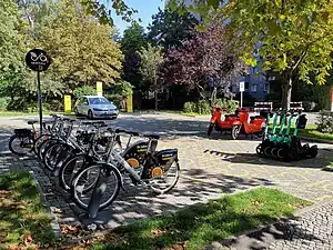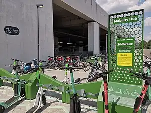 Mobility hubs are areas of public space where people can transition between public transport, bike sharing, car sharing, e-scooter rental, private bike parking and other climate-friendly modes of transport. Sometimes, there are also bicycle repair equipment, park & ride spaces or charging stations for electric cars present at these locations. In Germany, they are called Mobilitätsstation, Mobilstation or MOBIpunkt. This proposal wants to tag these as amenity=mobility_hub. In Belgium (Flanders), they are called Hoppinpunt or mobipunt. In the Netherlands, they are called Mobiliteitshub.