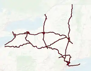 New York State Highways: 3, 5, 7, 8, 9A, 9G, 9H, 10, 12, 12A, 13, 14, 15, 16, 17, 21, 22, 23, 24, 25, 26, 27, 28, 29, 30A, 31, 32, 33, 33A, 35, 36, 37, 39, 42, 50, 52, 56, 58, 59, 60, 63, 77, 78, 100, 104, 109, 130, 149, 179, 199, 204, 205, 231, 263, 303, 332, 365, 370, 384, 408, 481, 495, 812, 878
