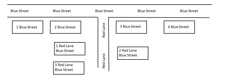 addr:housenumber=<n>; addr:street=Red Lane; addr:parentstreet=Blue Street