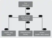 The graphic above shows that the model consists of three steps at most: A line variant (as a relation) contains an arbitrary amount of traffic ways, stopping places and/or accesses. A line (as a superior relation) shall be used to combine all the different variants of a line.
