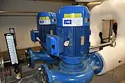 An inline centrifugal_pump driven by an electric motor. Centrifugal pumps can sometimes find inline, with less axial efforts than radial ones. |