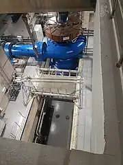 Hydropower generation sometimes involves pump for large scale water storage. Some power plants have pumps separated from turbines like in Veytaux, Switzerland where a 600 tons multi-stage centrifugal pump is located below a Pelton turbine, linked by a direct coupling (see this chart). The pump is driven by the generator used as an electric motor with electricity coming from transmission grid. When the pump s running, the Pelton turbine runs empty without water. |