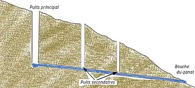 | Definition: | A gently-sloping man-made underground channel for transporting groundwater via gravity, with shafts visible from the surface. |