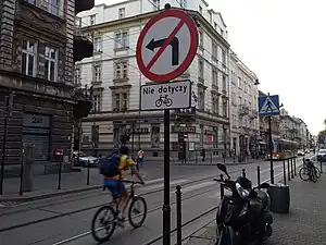 | Example of tramtrack embedded on a highway. Notice also that the highway is flanked by sidewalks, forcing bicycles to use the highway with the tramtracks. According to the proposal, this highway should be tagged. | Example of tramtracks as a separate way between highways. These highways would not be tagged under the current proposal, since the tramway is off limits to all but emergency vehicles (and trams). |