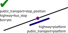 A stop or a station is a single object denoting an approximate location of where a vehicle stops to drop off and pick up passengers. It should be placed near a signpost or a platform, inside a station building, or between all the platforms for the stop.