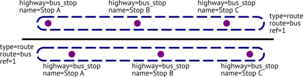 Such kind of a bare-bones route is easy to map and assemble; with the magic of Sparse Editing you can map an entire bus network for a medium-sized city in a day. And then begin adding extra properties and roads to relations.