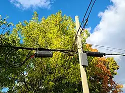 Several telephone, CATV and optical fibre cables cross on an utility pole. Two OSM ways should be drown crossing at the pole and following the cables. |