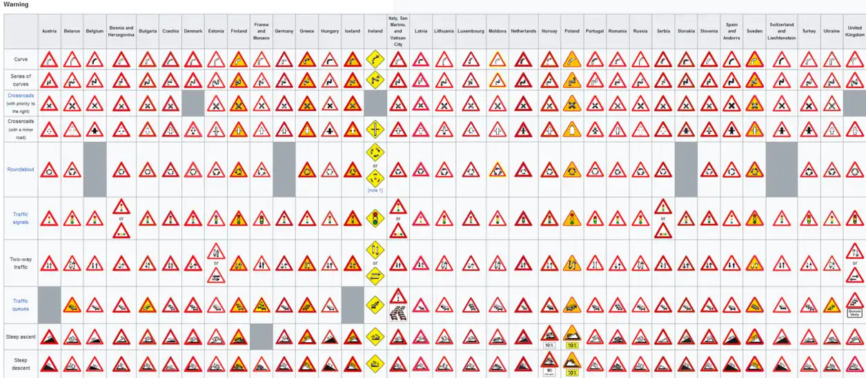 But there are other traffic signs...many more traffic signs. Each country has its own font-type, its colors and its drawings (specified in their own traffic laws). Using ISO codes we can be more specific for each traffic sign, and its graphic representation.
