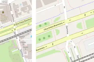 - [8] - a typical dual carriageway intersection - the road traffic light and the opposite pedestrian crossing for E->W traffic are ~50 m apart.