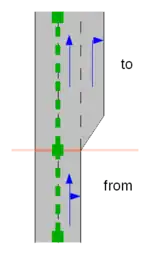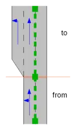• The i-th centre lane of the From Way (viewed from left to right, starting with 1) now connects to the leftmost centre lane of the To Way; continue to the right until you reach the rightmost centre lane of either the From Way or To Way. Note: if i is greater than the number of centre lanes in the From Way, no centre lanes are connected between the From Way and To Way. This is usually a data error. In such a situation routing applications might connect the rightmost centre lane of the From Way to the leftmost forward lane of the To Way.