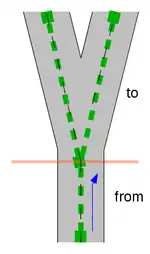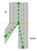 2 A one-way road with two lanes, where the rightmost lane forks into two lanes. To way