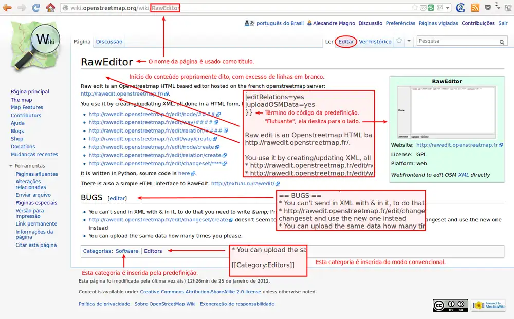 O texto preto dentro das caixas vermelhas é o código wiki que gera o resultado apontando pelas setas.