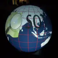 The Pufferfish Display is a method of projecting images onto a spherical display. The company Pufferfish Ltd that makes them is based in Edinburgh. There location is here. There are pictures and videos on their website. The hardware was initially used at State_Of_The_Map_Scotland_2012