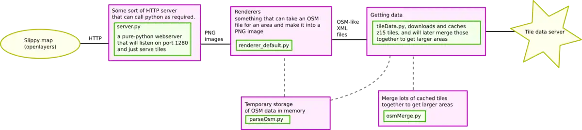 Pyrender is an on-demand map rendering framework, programmed in Python, written by User:Ojw. When it receives an HTTP request for a tile, it fetches the OSM data for the tile from OJW's tile data server, and renders the data as PNG.
