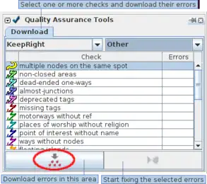 - Errors download of currently observed area in JOSM, from different error detectors. The type of error can be selected from a menu or a toggle dialog, in the second case, multiple kinds of error can be downloaded at once.