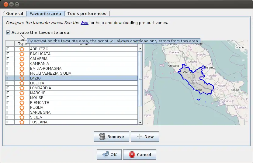 - Multiple favourite zones can be set so that only errors within it will be downloaded. It can be a rectangle, a polygon drawn by hand or an administrative boundary with specific tags (more info).