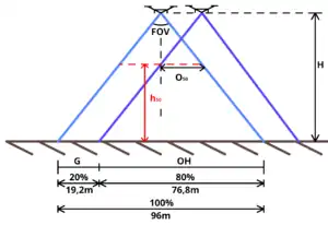 To maintain the same G and overlap at terrain level the drone moves between the "Front" and "Side" with the same shift which equals G. Since the angle FOV is constant, regardless of h, it means the overlap at height "Oh" is then (1 - G/Vh)