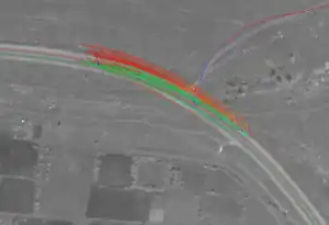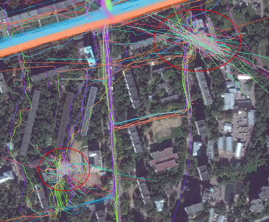 Два трека, которые аккуратно "ложатся" на дорогу, получены с помощью постобработки сырых измерений без применения сглаживающих фильтров. Две большие группы треков (красные и зелёные) как раз демонстрируют описанное выше, а именно вылет по "инерции" трека, вызванной действием фильтра, за пределы дороги. Также прекрасно видно, что разброс составляет почти две ширины дорожного полотна.