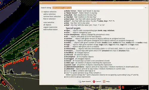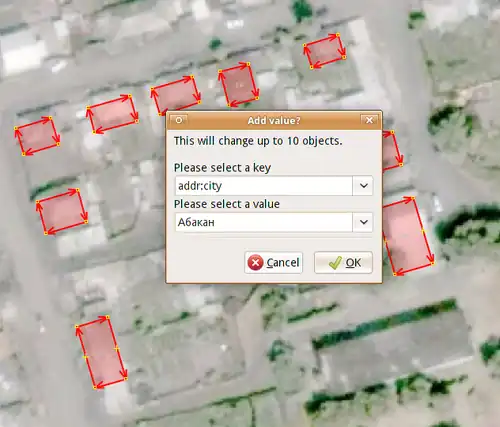 Нужно не забыть добавить название города в адреса, чтобы поисковики, которые ищут по тэгам, эти дома находили. Сначала найдём их сами: "addr\:street=* -addr\:city" значит объект с улицей, но без тэга addr:city.