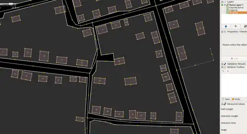 После этого можно рисовать дома (кнопка W). Можно спрятать слой Кадастра, чтобы не мешало. Если дом рисовать при помощи прямоугольника (W) поверх адресной точки, точка исчезнет, а тэги с неё перейдут на дом. Напомню, что полезно выделить пару точек на улице, вдоль которой рисуем дома, чтобы прямоугольники домов были сразу выровнены.