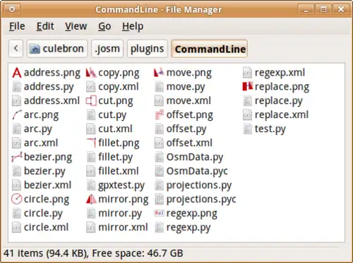4. Распаковываем архивы zip в папку JOSM/Plugins/CommandLine (в Линуксах это ~/.josm/plugins/CommandLine). Если папки нет - создаём её. В конце концов в папке CommandLine должен быть такой набор файлов: