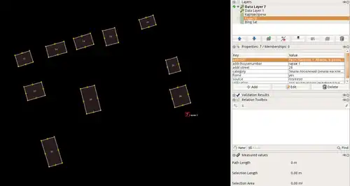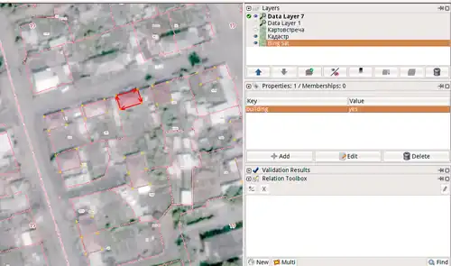 Теперь мы готовы к работе. Жмём на панели по кнопке A, затем на карте. Если там был участок с адресом, он появится в виде точки. Если там такого участка не было, ничего не появится. Дальше, если дом уже нарисован, копируем точку, удаляем её, выделяем дом, Shift+Ctrl+V (вставить тэги). Исправляем неточности, читаем тэги (category, utilization), делаем выводы (скажем, что дом многоквартирный, значит building=apartments, а вокруг него участок - landuse=residential), затем удаляем эти служебные тэги и fixme.